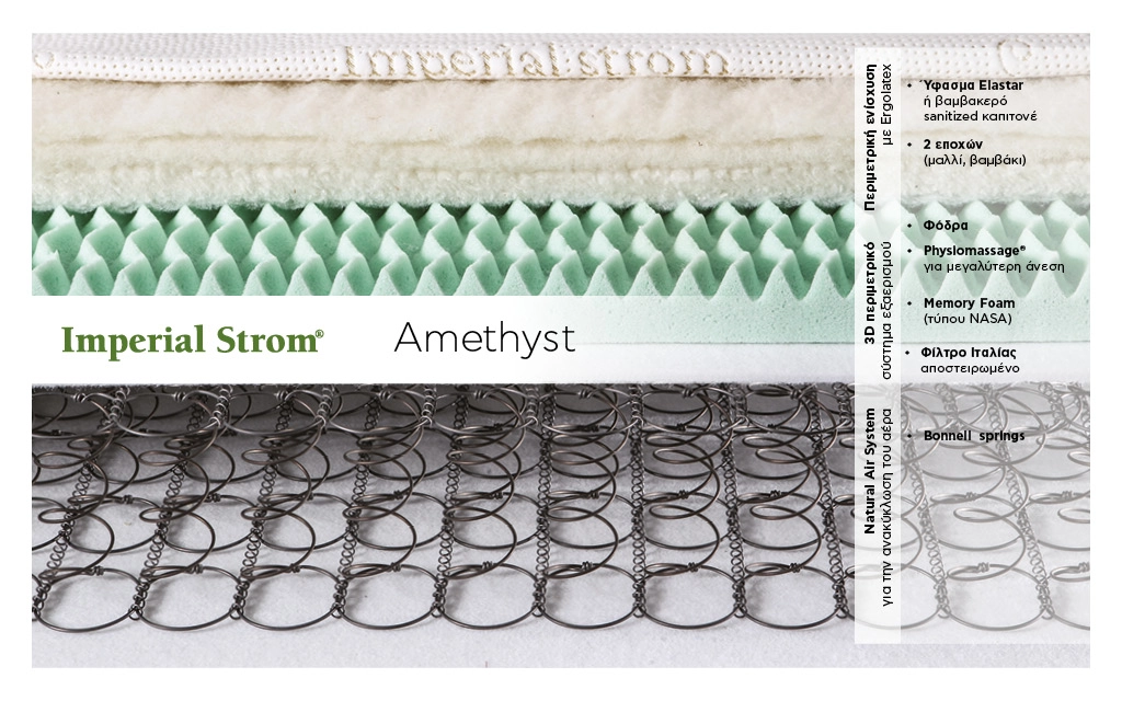 Το στρώμα ύπνου Amethyst είναι σχεδιασμένο έτσι ώστε να είναι ιδανικό για όλους τους σωματότυπους. Το σύστημα πυρήνα αποτελείται απο δι-κωνικά ελατήρια Bonnell springs υψηλής πυκνότητας και αποστειρωμένο φίλτρο Ιταλίας. Ο πυρήνας συμπληρώνεται με περιμετρική ενίσχυση απο ergolatex, συμβάλλοντας στην σταθερότητα και την αντοχή του στρώματος.