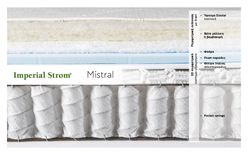 Οι ανέσεις ενός στρώματος αποτελούσαν πάντοτε μια καθοδήγηση στην παραγωγή μας. Κατασκευάστηκε, λοιπόν, ένα στρώμα, το Mistral, το οποίο διαθέτει 3D περιμετρικό σύστημα εξαερισμού. Αυτό προλαμβάνει την δημιουργία και ανάπτυξη μικροοργανισμών, καθιστώντας έτσι το στρώμα ένα υγιεινό προϊόν. Τα εσωτερικά υλικά του προσφέρουν περισσότερες ανέσεις και συμβάλλουν στη δημιουργία χαλαρωτικών στιγμών. Αυτά είναι ασφαλώς ο πορώδες αφρός (foam), όπως επίσης και η βάτα από μαλλί, είτε από βαμβάκι.