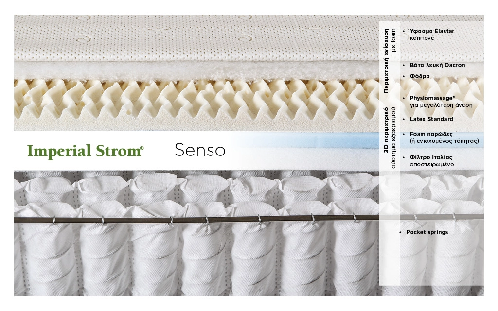 Ένα στρώμα ύπνου το οποίο συμβάλλει στην καλύτερη αίσθηση ύπνου είναι το Senso. Το στρώμα αυτό κατασκευάζεται από pocket springs, τα οποία το καθιστούν μαλακό και ιδανικό για άτομα διαφορετικού βάρους. Το στρώμα υπόσχεται έναν ξεκούραστο ύπνο, στον οποίο οι πελάτες μας θα νιώθουν μια συνεχή ανακούφιση χάρη στην ελαστικότητα του στρώματος Senso. Τόσο η περιμετρική του ενίσχυση με αφρό(foam), όσο και το αποστειρωμένο φίλτρο Ιταλίας, που τοποθετείται μονωτικά πάνω στα ελατήρια, βοηθούν ώστε το στρώμα να αποκτήσει μια καλύτερη στήριξη και να είναι πλήρως ανατομικό.